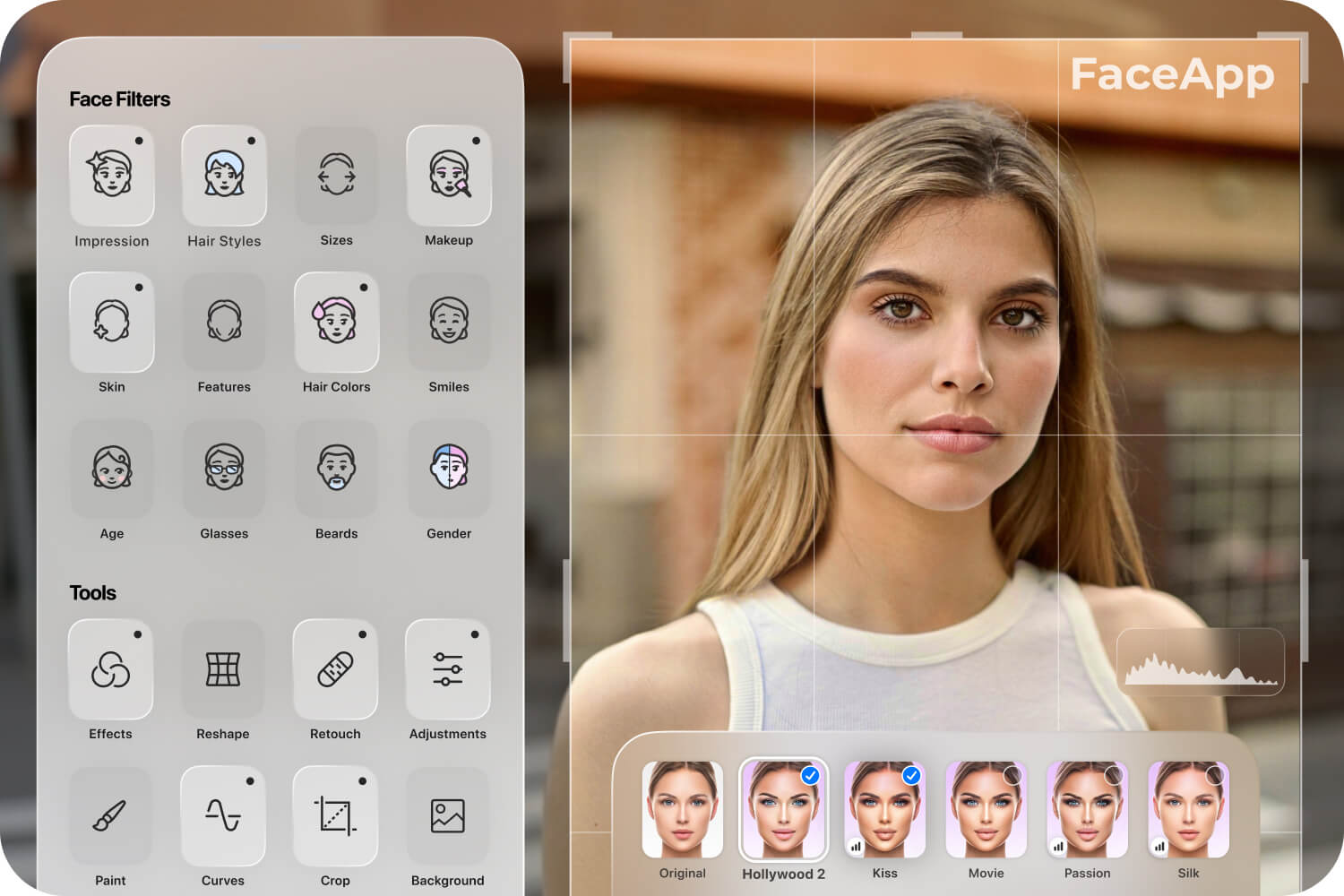 From light correction and tone balance to smoothing, reshaping, and portrait-specific enhancements, FaceApp’s all-in-one photo editor replaces what used to require a folder of apps — and hours of trial and error. It’s fast, intuitive, and elegant. Just smart and precise edits, and results that you like.