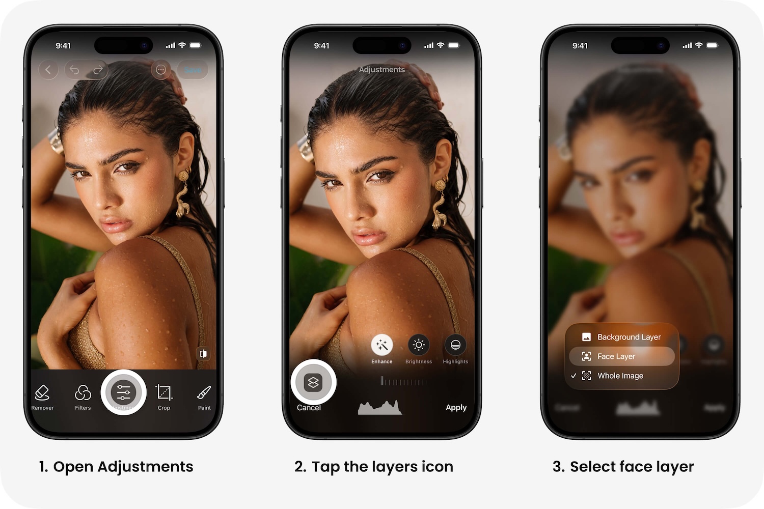 Open Adjustments, tap the layers icon, choose Face or Background, then refine with Mask Editing. Brightness, contrast, and saturation can be fixed locally, exactly where and how you want them.