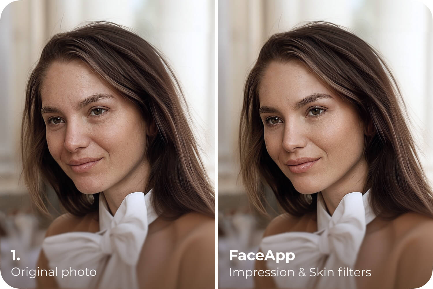 • Start with subtle filters in the Impression tab — gentle enhancements that preserve your natural vibe.